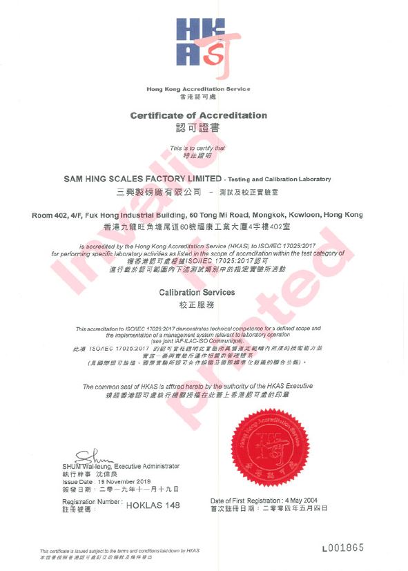 三興製磅廠有限公司 – 測試及校正實驗室獲得香港HOKLAS認可(註冊號碼 HOKLAS 148)。